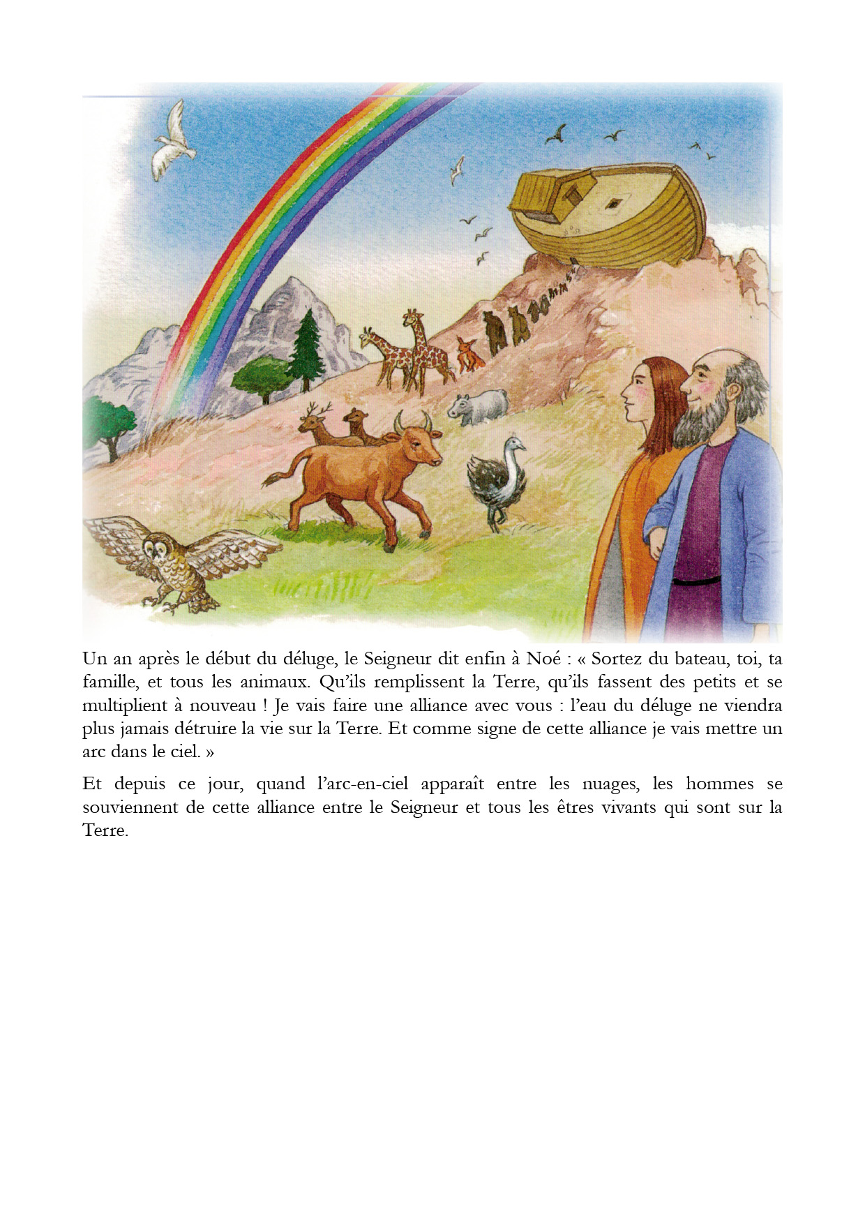 Un an après le début du déluge, le Seigneur dit enfin à Noé : « Sortez du bateau, toi, ta famille, et tous les animaux. Qu’ils remplissent la Terre, qu’ils fassent des petits et se multiplient à nouveau ! Je vais faire une alliance avec vous : l’eau du déluge ne viendra plus jamais détruire la vie sur la Terre. Et comme signe de cette alliance je vais mettre un arc dans le ciel. »
